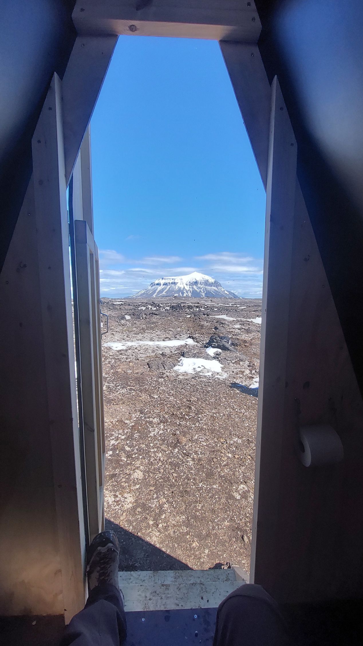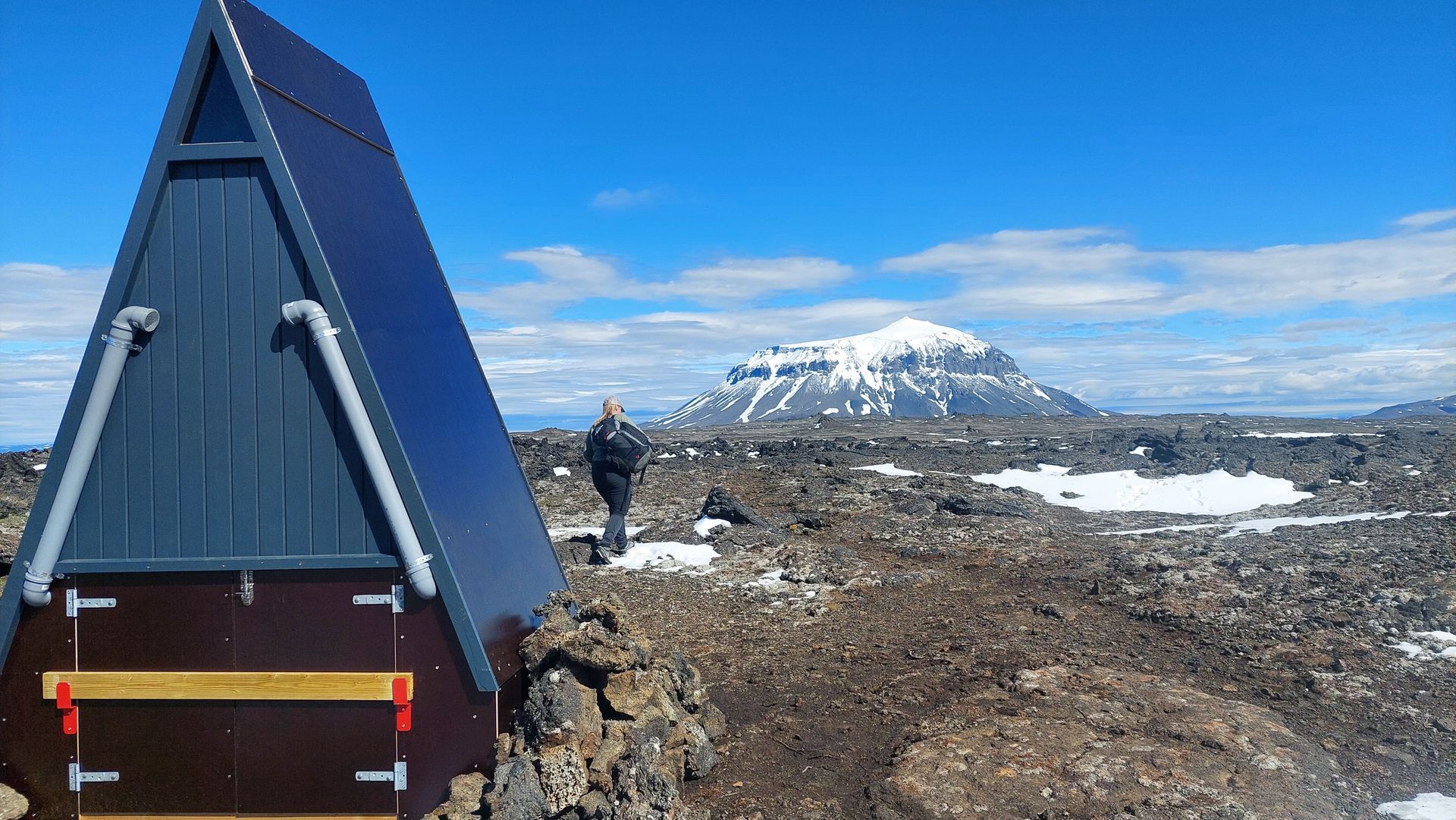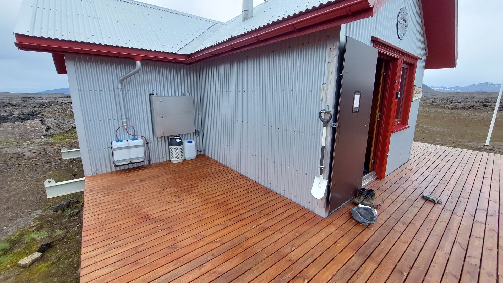 The hut was built in 2016. The hut sleeps 16 and has a oil-operated stove for cooking and for the heating of the hut. During summer time drinking water is collected from the roof into reservoirs on the sidewalls of the hut. This is only active in July and August and travelers are always urged to bring their own drinking water when travelling in the Ódáðahraun area.There is a walking route from the Herðubreið mountain W to the hut, approx. 9-10 km, marked by yellow sticks. The marked walking route continues S to Dreki hut, E of the Dyngjufjöll massif.