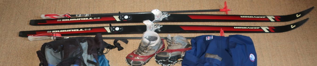 Cross-country skis and ski boots. It is best to have skis with steel edges/off-piste skis