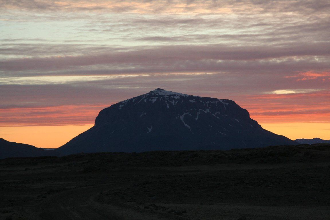 Herðubreið is a 1682 meter high hyaloclastite mountain north of Vatnajökull. It is in Ódáðahraun and is often referred to as „The Queen of Icelandic mountains“ because of it's beautiful shape. The mountain was formed in an eruption under glacier. On the top are lava fields which means that the eruption reached above the glacier surface. Such mountains, that is hyaloclastite mountains with lava fields on top, are called table mountains. Mount Herðubreið was elected the national mountain of Iceland the year 2003.