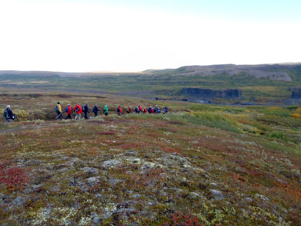Í Vesturdal fengum við okkur góða hressingu og síðan hófst seinni hluti göngunnar. Við héldum að Hljóðaklettum, gengum meðfram Tröllkarlinum og nokkrir fóru í Kirkjuna. Síðan héldum við að Rauðhólum þar sem var fallegt útsýni yfir það svæði sem við höfðum gengið um. Nú var stefnan tekin þvert yfir Ásheiðina, fórum um Kvíar, Sund, Klappir og komum loks að risavöxnum skessukötlunum ofan við Ásbyrgi. Það þótti mörgum mikilfengilegt að horfa yfir Ásbyrgi en síðan héldum við beint niður með náttúrvættinu að austanverðu og gönguferðinni lauk loks við Gljúfrastofu en þá höfðum við verið um 8 tíma á göngu. Fararstjóri var Örn Þór Emilsson myndir Frímann Guðmundsson.