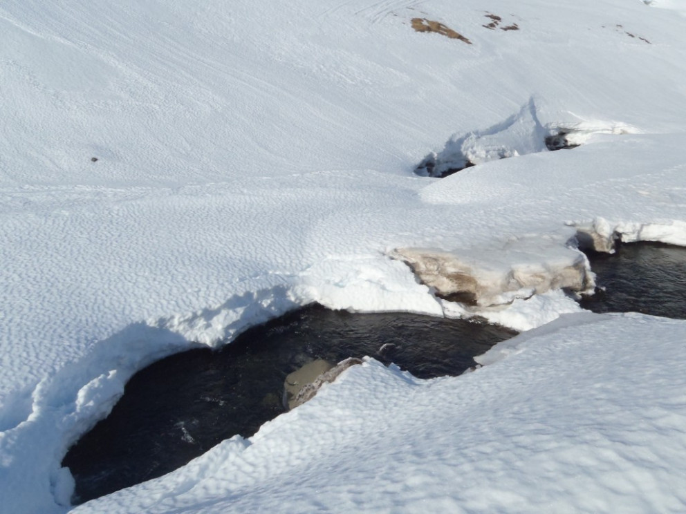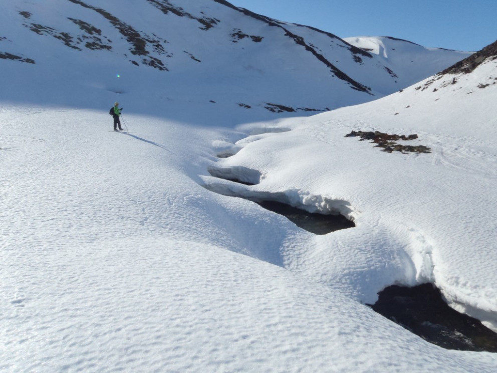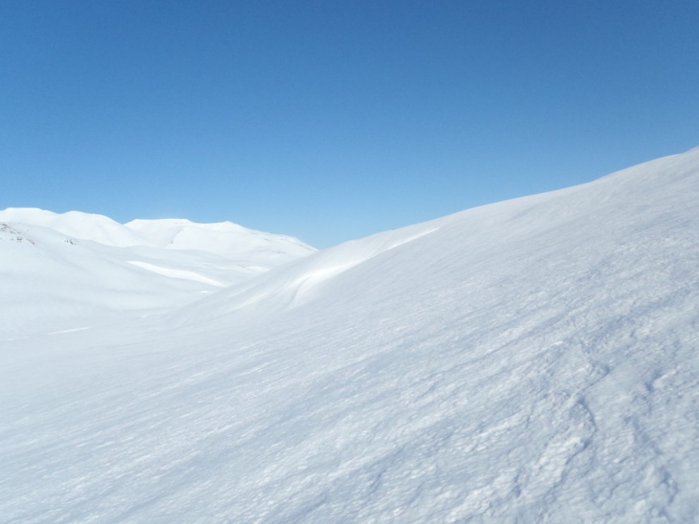 Nú skein sól á heiðum himni en í fyrri ferðinni hafði verið rok á móti og skafrenningu svo ekki sá út úr augum. Farið var frá Hálöndum í Hlíðarfjalli og beint inn dalinn og smá saman niður í gilið. Við vorum ekki nema 2.5 tíma inneftir og rúmann klukkutíma til baka. Sett hér inn til gamans. FG