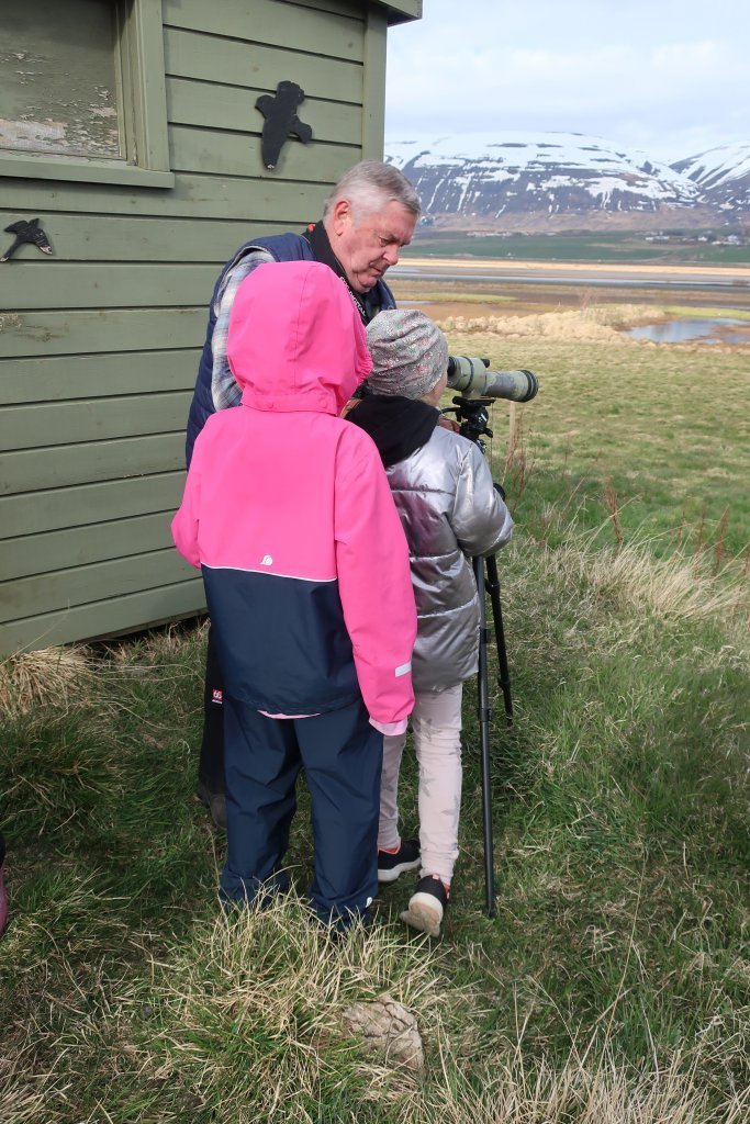 Fyrsta barna- og fjölskylduferð ársins var 19. maí kl. 17. Fyrirhugað var að fara í Naustaborgir en sökum framkvæmda þar þá var lítið að sjá. Því var farið að Kristnestjörn í Eyjafirði. Þrátt fyrir frekar kalsalegt veður þá mættu 14 börn með foreldrum sínum eða afa og ömmu. Jón Magnússon og Sverrir Thorstensen sáu um að fræða börnin um fluglana sem sáust og benda þeim á áhugaverða fugla. Foreldrar og afar og ömmur voru ekki síður spennt. Jón og Sverrir voru með sérstaka sjónauka til að skoða fugla og þótti börnunum það spennandi. Mörg barnanna skráðu hjá sér hvaða fuglategundir þeir sáu. Við þökkum Jóni og Sverri fyrir skemmtilega ferð. Myndir Þorgerður Sigurðardóttir og Fjóla Kristín Helgadóttir..